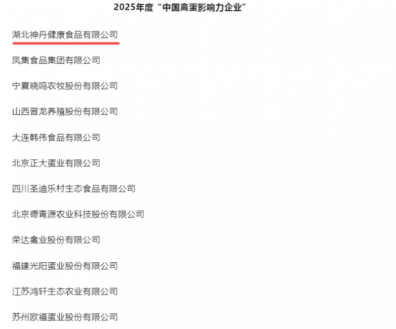 标题:湖北神丹荣登2025年度中国禽蛋最具影响力企业榜首
